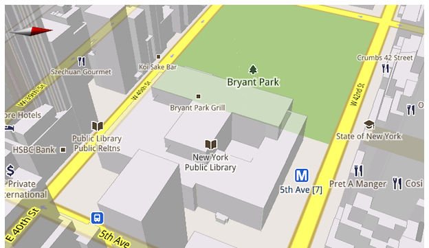 Eine weitere interessante Sache ist die 3D-Ansicht. Zoomen Sie sich nahe genug die Details ran. Dadurch können Sie die Karte samt einzelnen Straßen zu sehen bekommen. Interessanterweise wird die Karte automatisch bei jeder Bewegung gedreht (Kompass-Funktion).