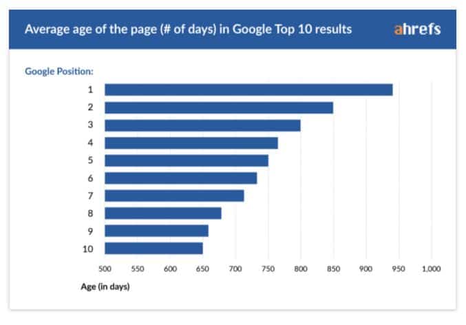 Die folgende Ahrefs-Studie zum Thema Wie lange dauert es, in Google zu ranken? zeigt aber was anderes: Es ist auch wichtig zu beachten, dass in einigen Fällen ältere Dokumente für eine Suchanfrage höher gewichtet werden als neuere, wie in der folgenden Grafik dargestellt.